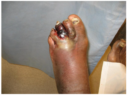 Penyakit Mikrovaskular: Pada tingkat mikroskopis, hiperglikemia menyebabkan disfungsi endotel, penebalan membran basal kapiler, dan keadaan pro-trombotik. Perubahan ini semakin mengganggu perfusi di tingkat jaringan, memperburah hipoksia, dan mendorong nekrosis. Gangren adalah manifestasi klinis dari kematian jaringan masif akibat iskemia berat ini.