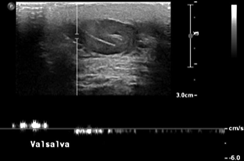 • Color Doppler memberikan visualisasi langsung dari aliran darah. Saat pasien melakukan manuver Valsalva, adanya refluks akan terlihat sebagai perubahan warna yang tiba-tiba pada pembuluh darah (misalnya, aliran yang tadinya berwarna biru menjauhi transduser, berubah menjadi merah menuju transduser), yang menandakan pembalikan arah aliran.