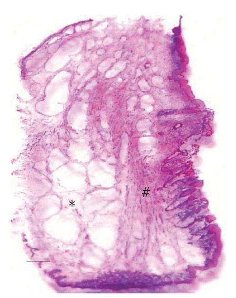 Gambar 1. Perubahan patologi pada hemoroid. (*) Dilatasi venous plexus hemoroid