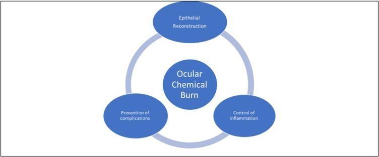 Tujuan terapi utama adalah untuk menekan inflamasi, mendorong re-epitelisasi, dan mencegah pelelehan jaringan kornea serta infeksi sekunder. Strategi tatalaksana disesuaikan dengan tingkat keparahan dan fase klinis luka bakar.